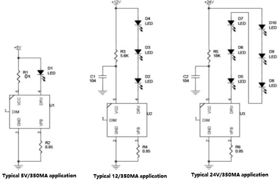 例如:DC12V輸入,負載Vled 3V 350MA三燈串聯(lián),在常溫下工作,輸入電壓大于9.5V,LED工作電流穩(wěn)定,當輸入電壓低于9V,LED電流下降,如果輸入電壓不足以提供DRV啟動電壓及LED正向電壓,LED電流會減少。