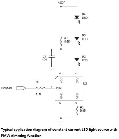HX304提供了輸出端使能控制引腳DIM,內(nèi)部具有上拉電阻,在不需要使用使能引腳的情況下,該引腳懸空,默認輸出恒流。用戶也可以采用5V邏輯通過該引腳對輸出電流進行調(diào)光控制,實現(xiàn)高質(zhì)量的PWM調(diào)光,與HX304配合使用作為大功率恒流驅(qū)動器。