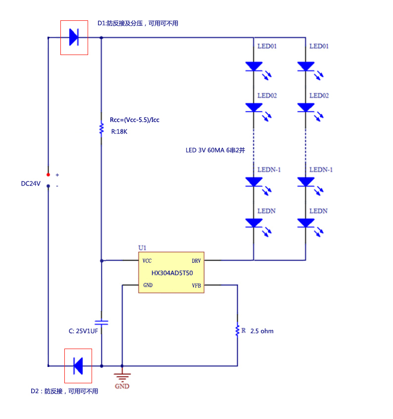 HX304外圍元件少,應(yīng)用可靠性好,芯片內(nèi)部包含高精度的帶隙基準(zhǔn)源,5.5V電壓調(diào)整器,過溫保護(hù)電路和低壓差驅(qū)動電路等。