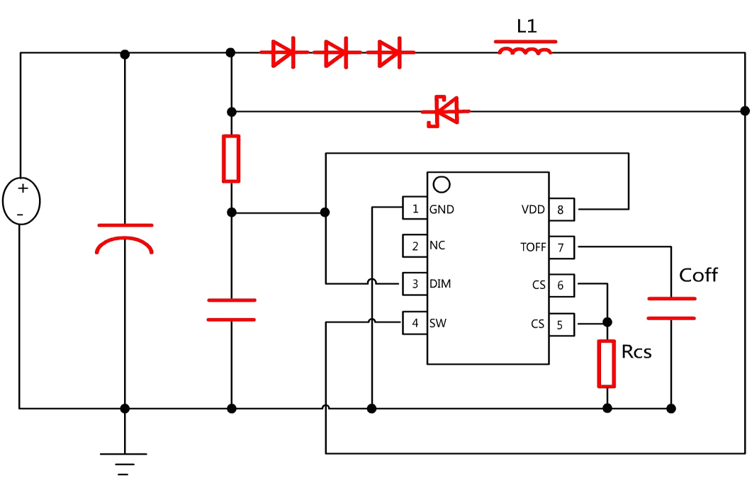 調(diào)光腳,支持PWM調(diào)光和線性調(diào)光;DIM接地則關(guān)斷輸出,DIM電壓高過(guò)3.0V則電流100%輸出 |